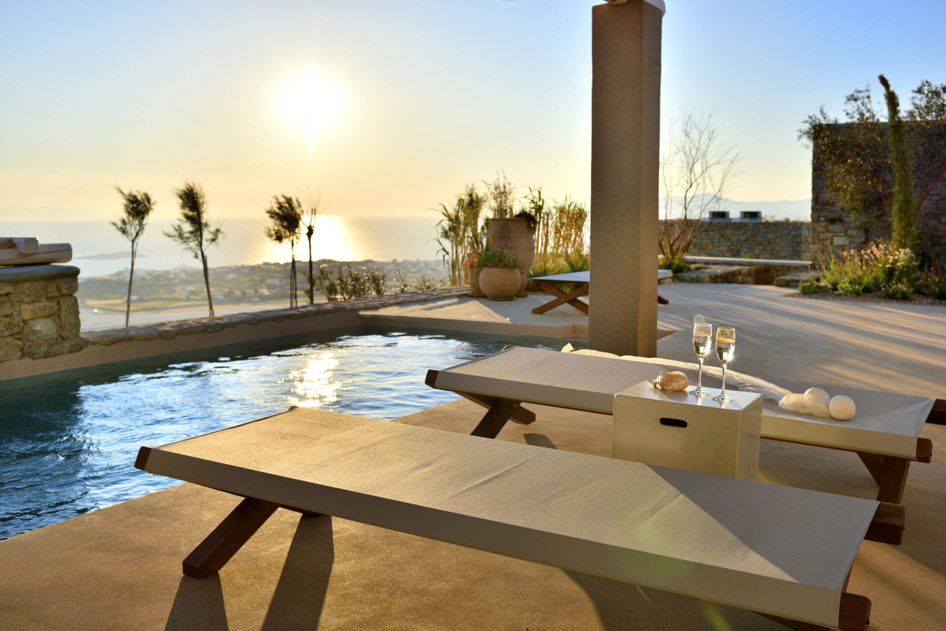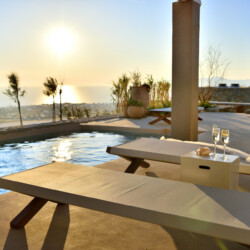 Luxurious private pool with jets. Party in the glamorous splendor of your palatial outdoor dining and lounge areas where under star-lit skies you will dance to dawn while making Mykonos summer memories that will never fade.